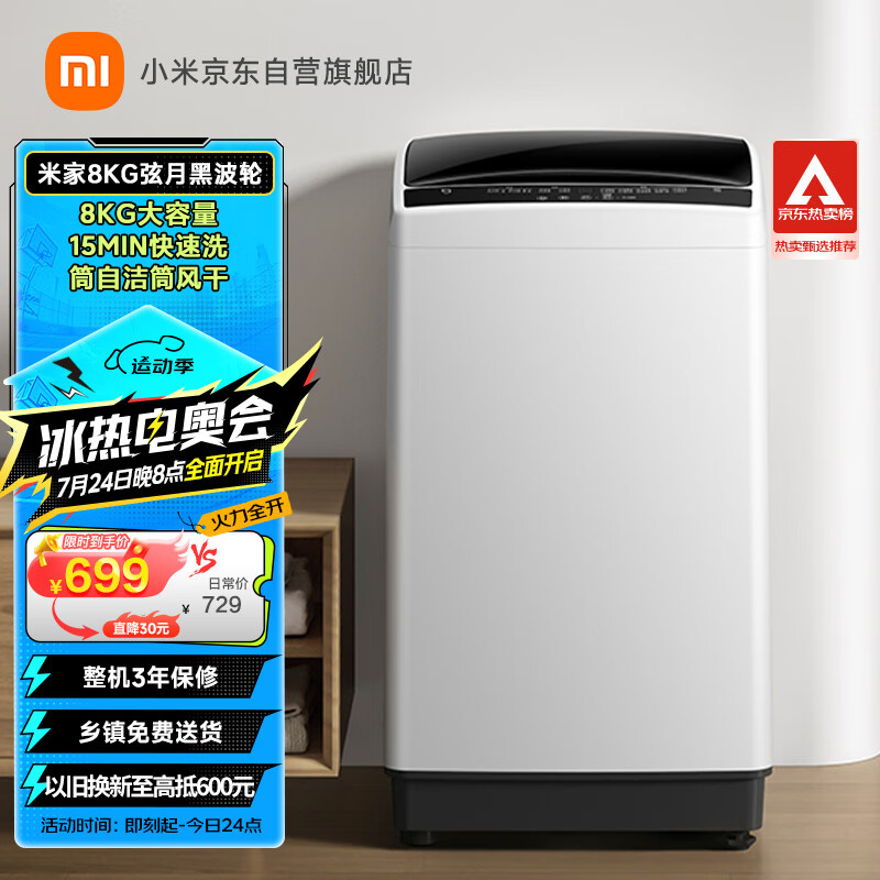 米家小米波轮全自动洗衣机租房宿舍 8KG大容量不锈钢内桶 健康桶自洁弦月黑波轮 XQB80MJ203价格:699.00元!