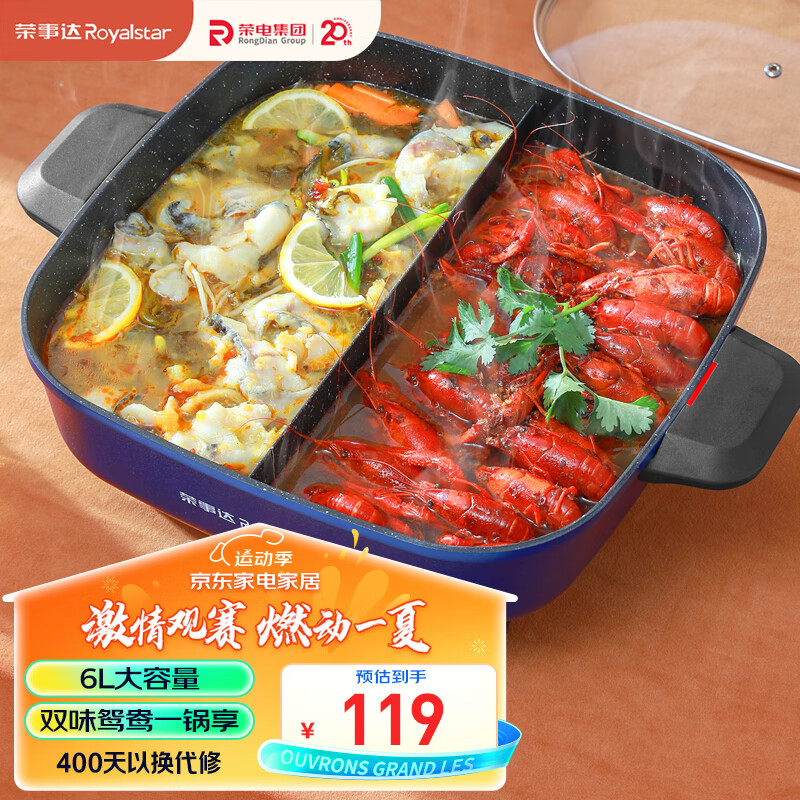 荣事达(Royalstar)鸳鸯电火锅电炒锅家用多功能煎烤涮一体炒菜电煮锅6L大容量不沾电热锅电锅 RHG-136B(Y)价格:119.00元!