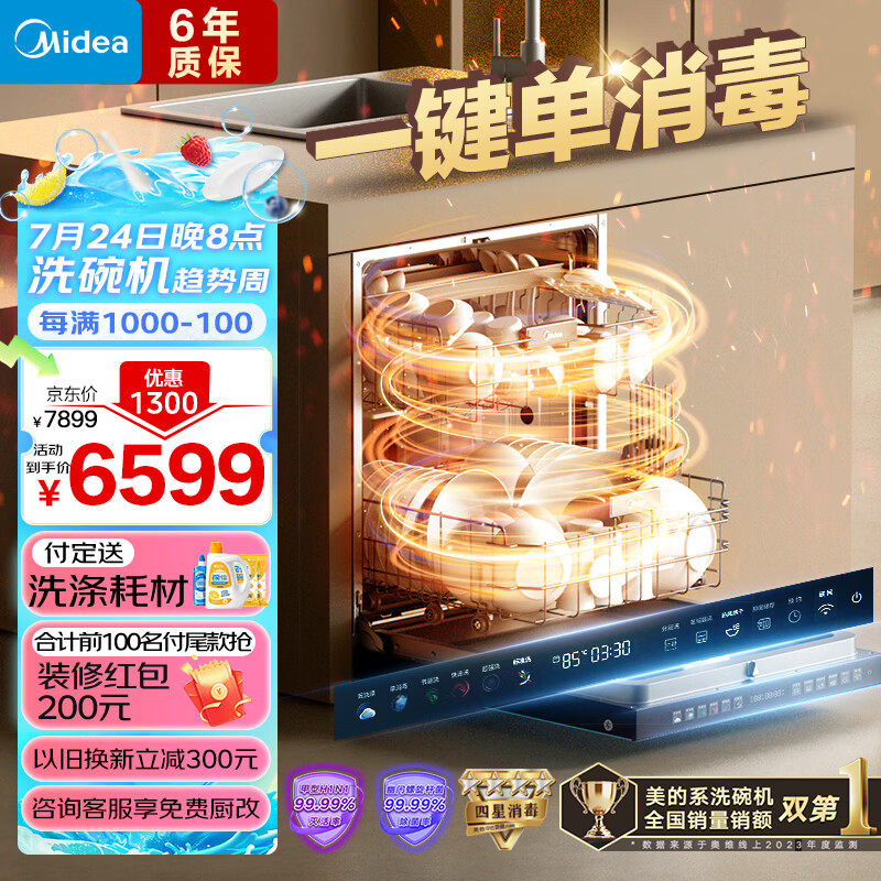 美的(Midea)16套嵌入式洗碗机晶焰星河M9 五臂飓风洗一键单消毒变频四星消毒105℃热风烘干168h存储价格:7299.00元!