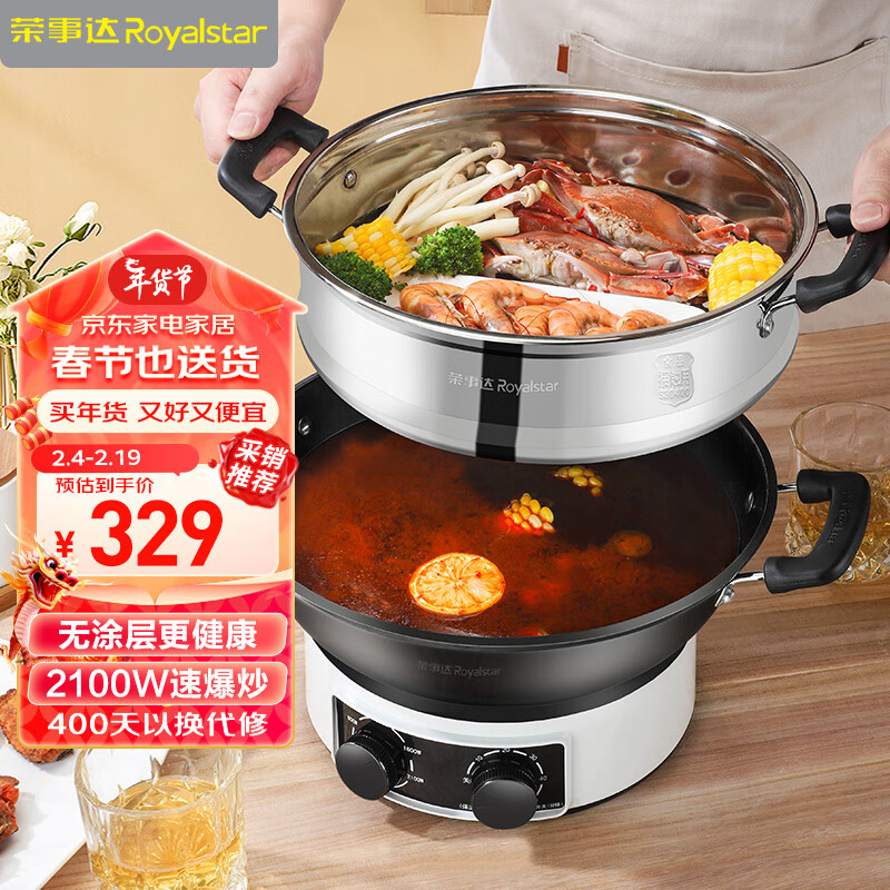 荣事达(Royalstar)电炒锅家用多功能蒸包子锅32CM电锅电炒锅电煮锅电火锅电蒸锅RDG-T32CG单笼价格:329.00元!