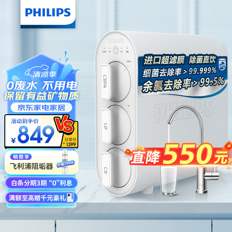 飞利浦(PHILIPS)净水器家用净水机UF10 2年超滤膜 不插电无废水零噪音直饮 母婴适用矿物质净水器 AUT1210价格:849.00元!