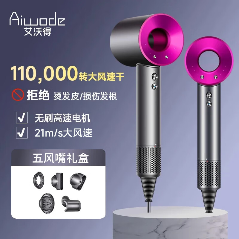 艾沃得(Ai wo de)无叶高速吹风机家用吹风筒1600W发廊大风力大功率电吹风速干低噪音不伤发 玫红色【五风嘴】 礼盒装价格:188.00元!