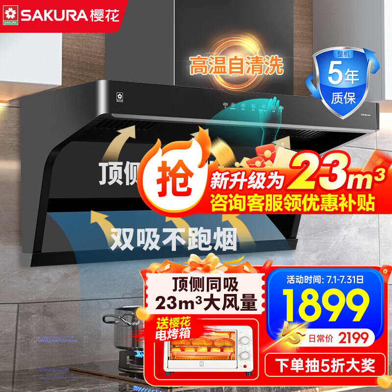 樱花(SAKURA)油烟机顶侧双吸抽油烟机家用抽烟机触控式上下双进风口23立方大吸力脱排油烟机免拆自清洗挥手智控 CXW-280-QA01【7字型顶侧双吸】价格:2099.00元!