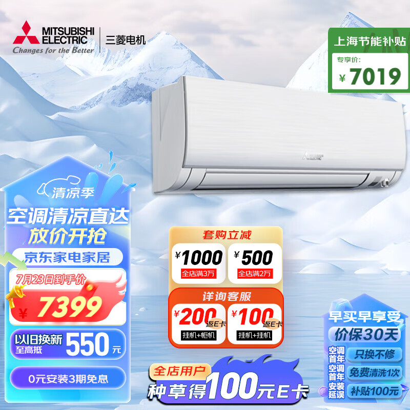 三菱电机14-21㎡适用 新一级能效 1.5匹 变频冷暖 WIFI智能 家用空调挂机 开启式清洁 一价全包MSZ-KY12VFK价格:7399.00元!