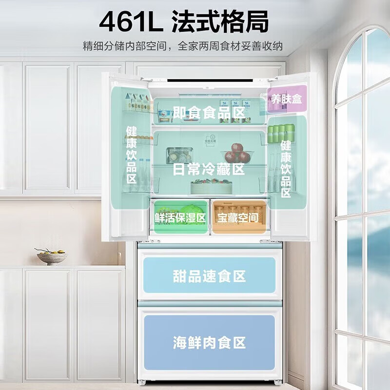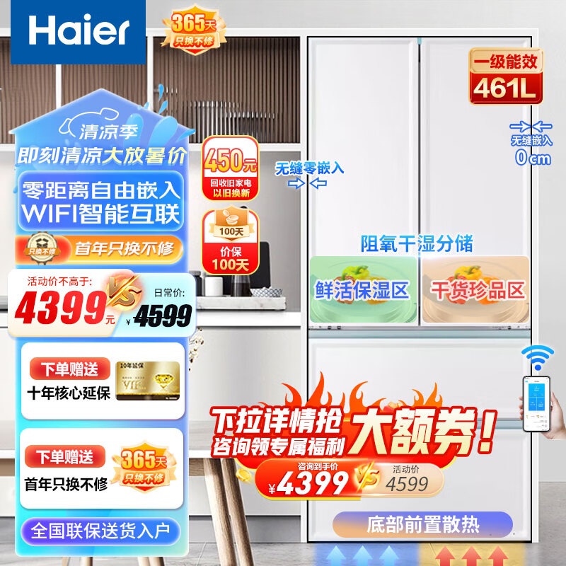 海尔【零嵌】法式四门风冷无霜一级变频家用大容量冰箱WIFI智控干湿分储除菌净味BCD-461WGHFD45W9U1价格:4399.00元!