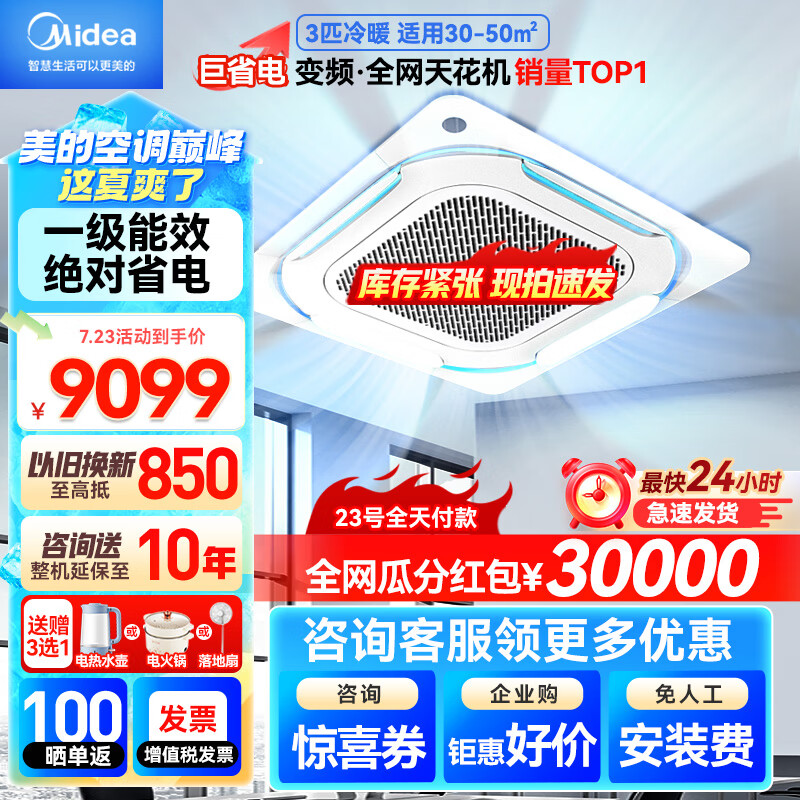 美的(Midea)3匹天花机空调吸顶空调商用中央空调一拖一吊顶空调新一级能效节能省电220VRFD-72QW/BDN8Y-D(B1)A价格:9099.00元!