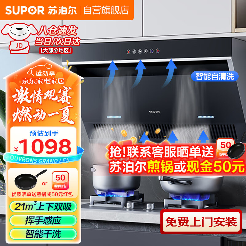 苏泊尔(SUPOR)油烟机侧吸式抽油烟机燃气灶家用厨房大吸力21立方爆炒大吸力挥手控制自清洗吸油烟机DJ2C3 21立方超大吸力价格:1498.00元!