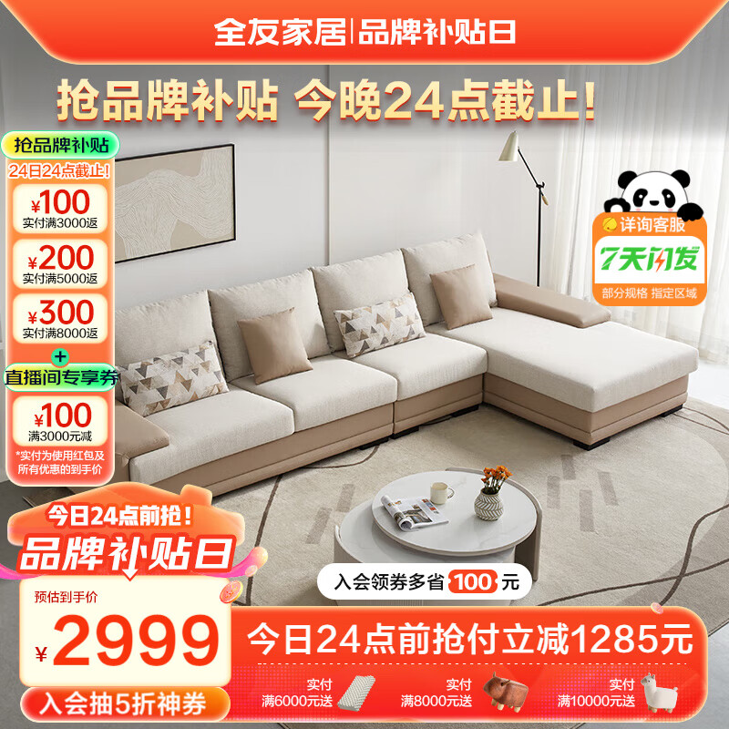 全友家居 现代简约布艺沙发家用大户型客厅实木架贵妃转角沙发102085价格:4284.29元!