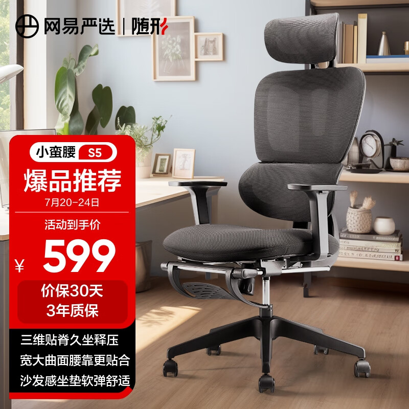 网易严选小蛮腰S5有搁脚 人体工学电脑椅办公椅电竞老板会议学习座椅凳子价格:599.00元!