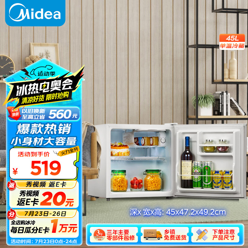 美的(Midea)45升单门迷你微型小冰箱租房宿舍办公室家用冷藏小型节能省电电冰箱低音 美妆可用BC-45M价格:519.00元!