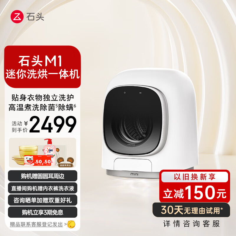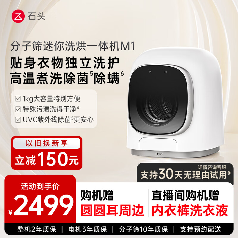 石头(roborock)分子筛迷你洗烘一体机M1 洗烘一体家用小型小尺寸1kg公斤滚筒儿童婴儿内衣全自动洗衣机 星月银 洗烘一体机价格:2499.00元!