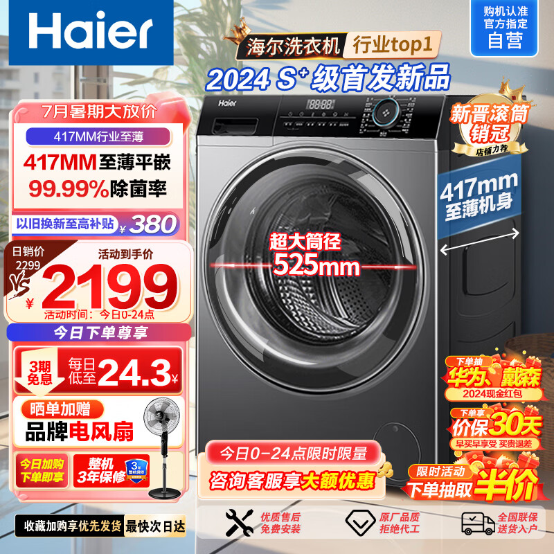 海尔(Haier)全自动滚筒洗衣机8KG大容量超薄平嵌 变频羊毛羽绒洗大筒径筒自洁除菌螨14126升级MATE33s以旧换新价格:2198.00元!