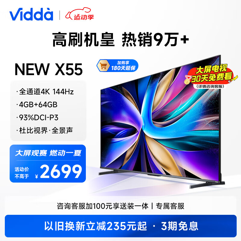 Vidda NEW X55 海信电视 55英寸 144Hz高刷游戏电视 HDMI2.1 4+64G 4K液晶智能游戏大屏以旧换新55V3K-X价格:2699.00元!