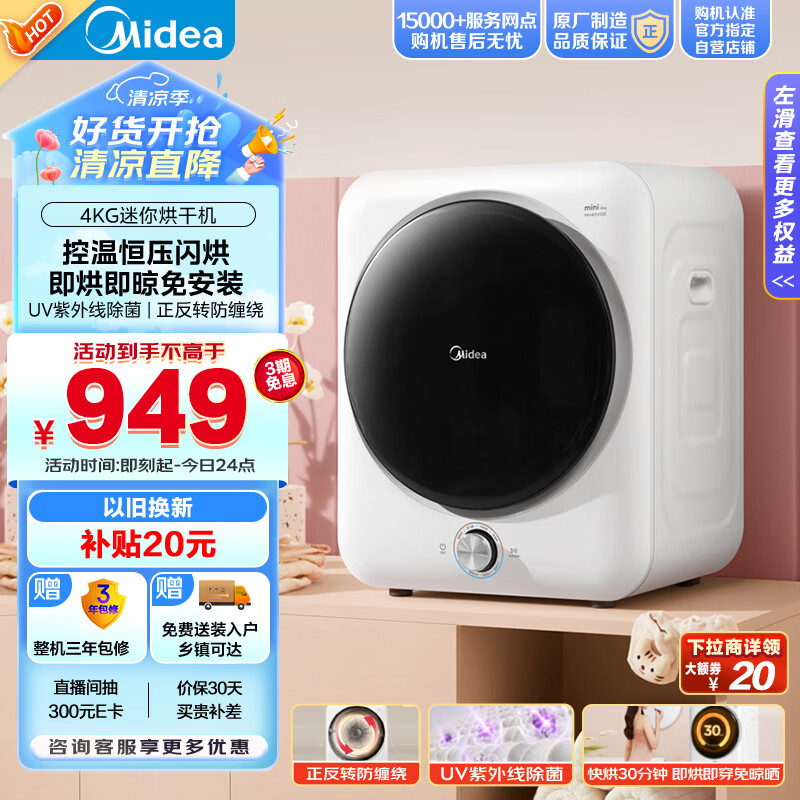 美的(Midea) 4公斤烘干机 回南天神器 滚筒式干衣机小型烘衣机 衣物即烘即穿免安装 紫外线除菌 MH40V10E价格:949.00元!