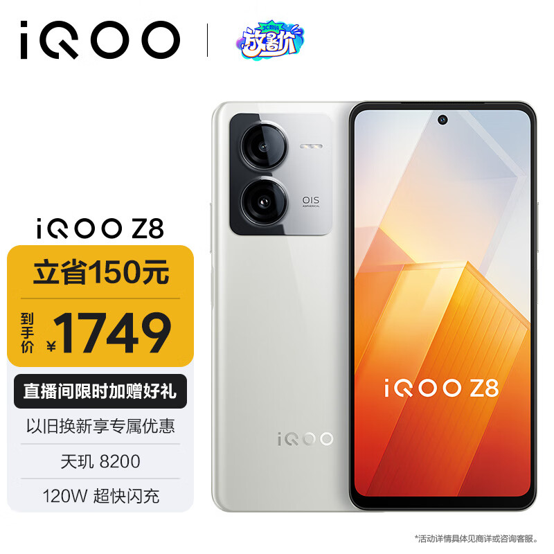 vivo iQOO Z8 12GB+512GB 月瓷白 天玑 8200 120W超快闪充 5000mAh超长续航 5G电竞手机价格:1899.00元!