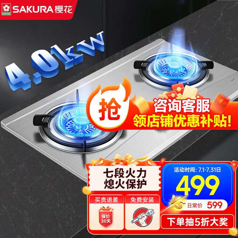 樱花(SAKURA)燃气灶双灶家用台式燃气灶天然气灶大火力液化气嵌入式煤气灶不锈钢灶易清洁一级能效 JZY-GBZ04【液化气】 燃气灶价格:440.00元!