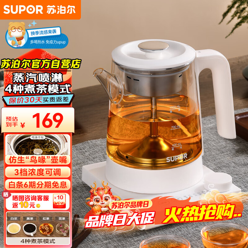 苏泊尔(SUPOR)养生壶 煮茶器大容量蒸汽喷淋式煮茶壶烧水壶 电热水壶花茶壶蒸茶器 SW-10C12【茶汤分离】价格:169.00元!