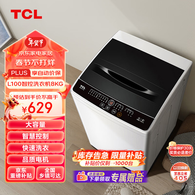 TCL 8KG智控洗衣机L100 大容量波轮 全自动 租房神器 桶风干自清洁 23分钟快洗 一键脱水 B80L100价格:629.00元!