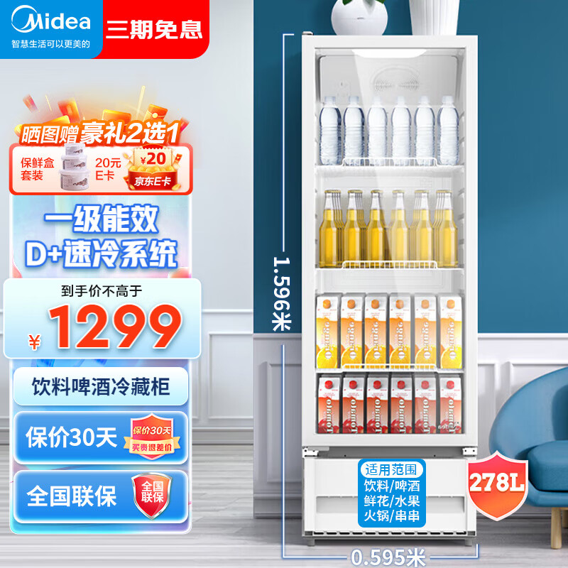 美的(Midea)展示柜商用278升 风循环制冷全冷藏立式透明玻璃门陈列柜 商超便利店啤酒保鲜饮料柜SC-278GM白价格:1359.00元!