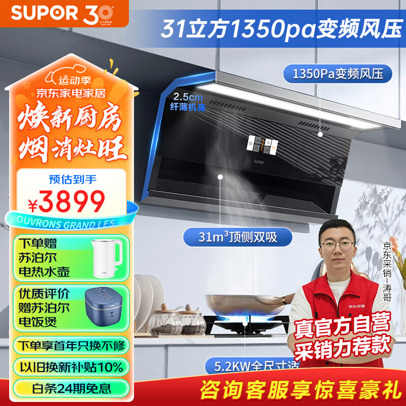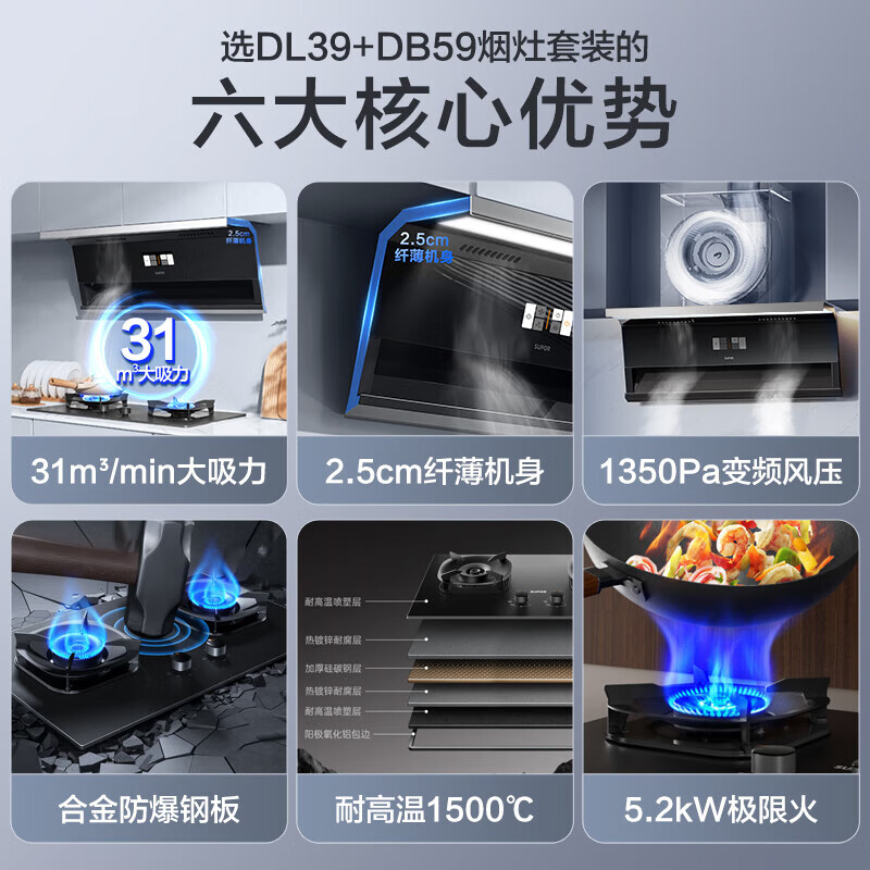 苏泊尔(SUPOR) 顶侧双吸变频1350pa风压烟灶套装 31立方大吸力烟灶套装 家用油烟机燃气灶套装 DL39+DB59液价格:3899.00元!