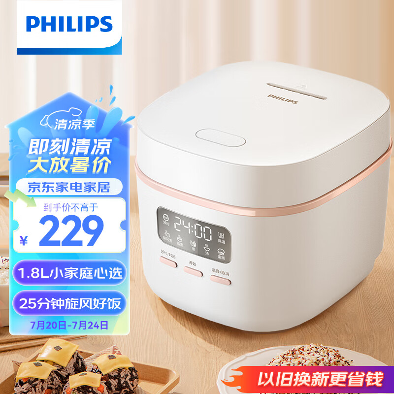 飞利浦(PHILIPS)多功能1.8L迷你电饭煲一键旋风煮 24小时智能预约电饭锅HD3063/20白色(推荐1-2人)价格:229.00元!