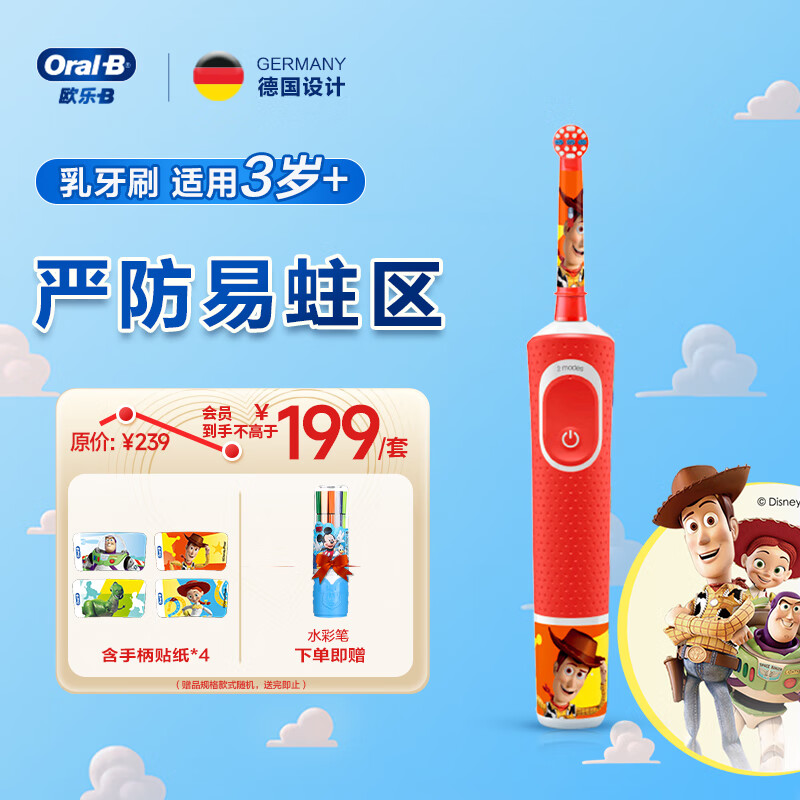 欧乐B儿童电动牙刷 3-7岁乳牙期专用乳牙刷玩具总动员/皮克斯(刷头图案随机)D100kids日常清洁护齿价格:199.00元!