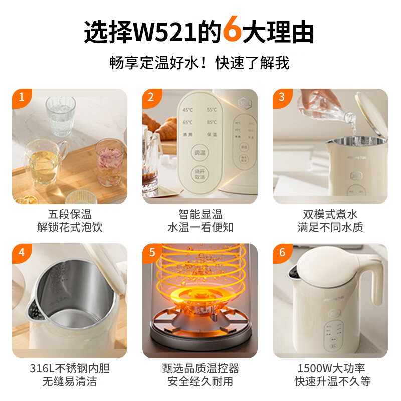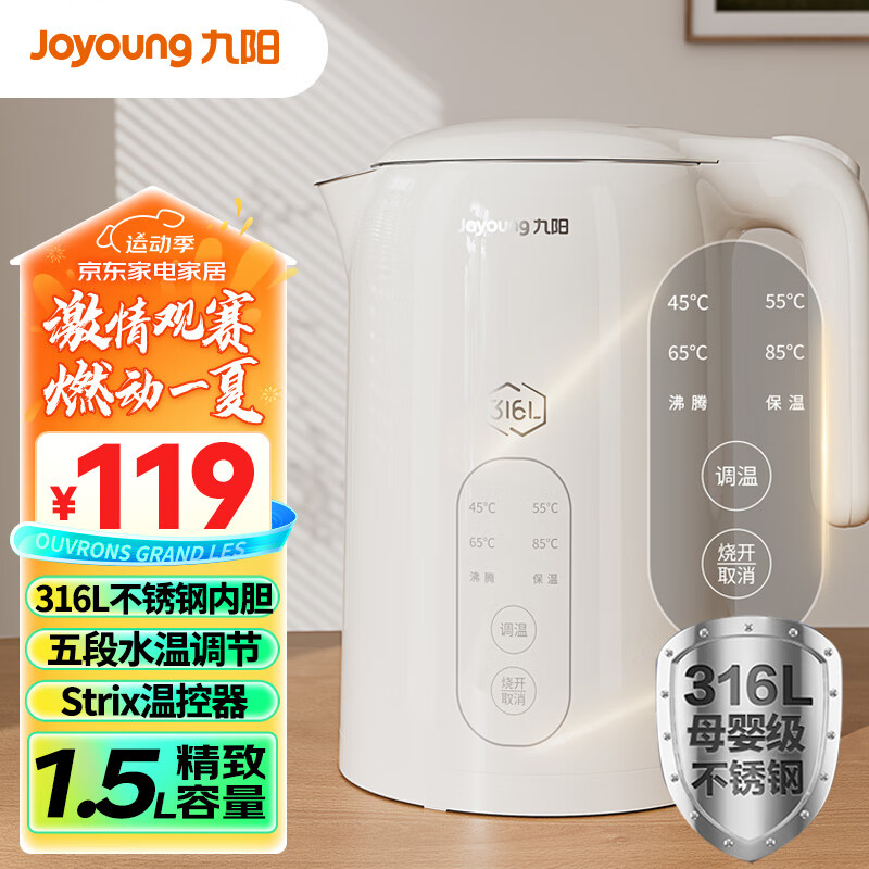 九阳(Joyoung)热水壶烧水壶电水壶1.5L 5段水温 无缝内胆 316L恒温开水壶K15ED-W521价格:119.00元!
