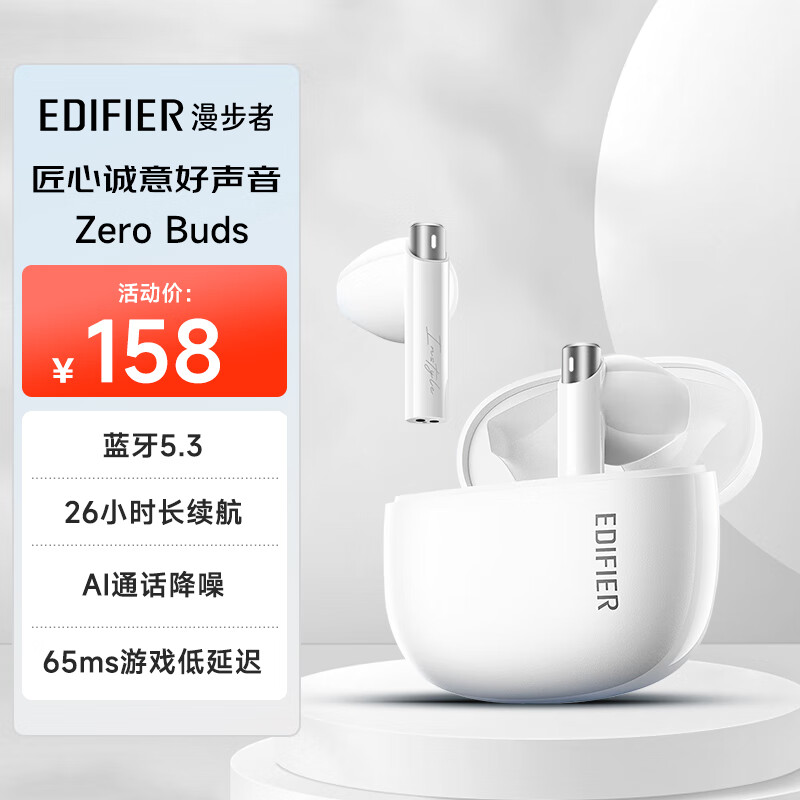 漫步者(EDIFIER)Zero Buds 真无线蓝牙耳机 音乐耳机 半入耳式耳机 适用苹果小米华为 荼白价格:158.00元!