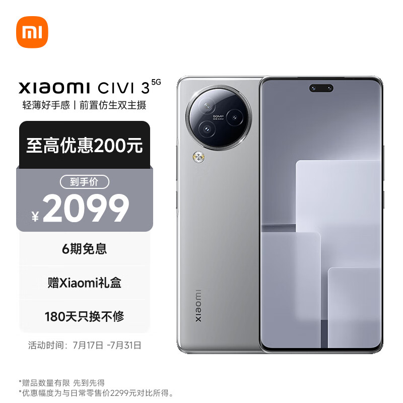 小米 Civi 3 前置仿生双主摄 光学防抖镜头 12GB+256GB 椰子灰 5g手机 澎湃OS SU7 汽车互联 AI手机价格:2099.00元!