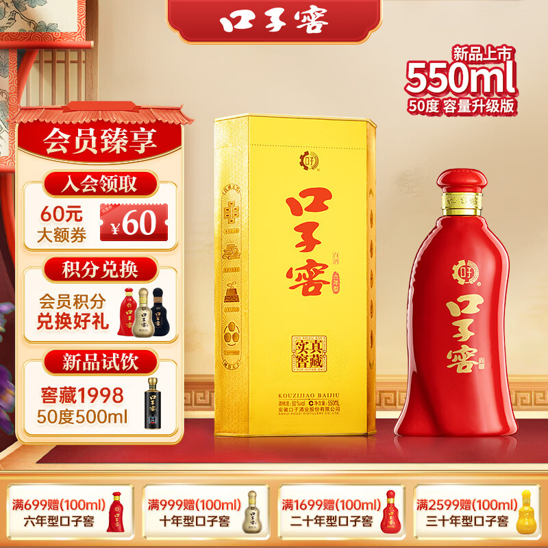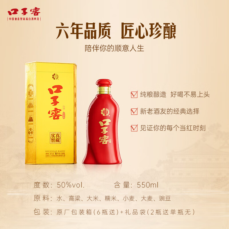 口子窖 六年型 兼香型白酒 50度 550ml 【容量升级】纯粮酿造价格:182.00元!