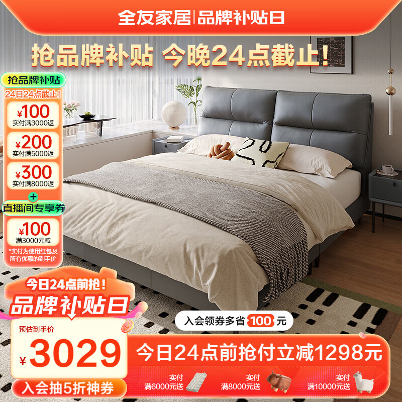 全友家居 头层牛皮现代简约真皮艺软包床1.8x2米主卧室双人大床116019价格:4327.14元!