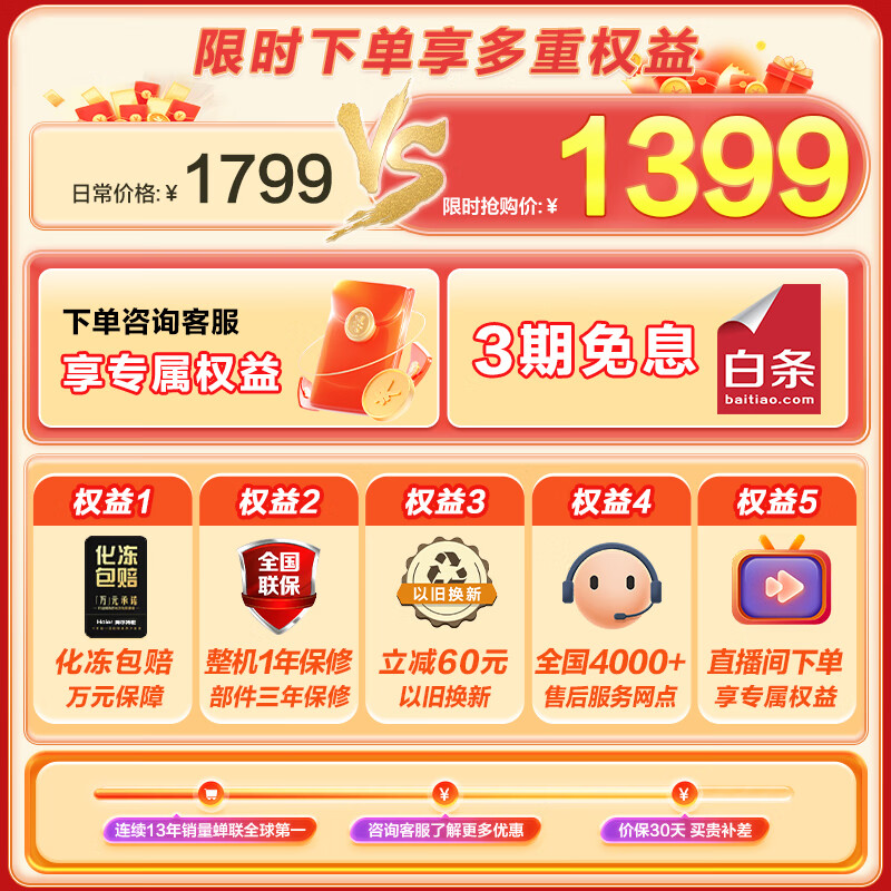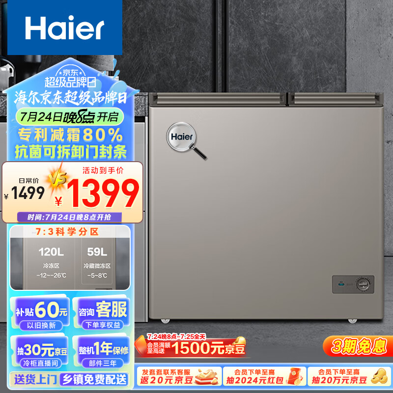 海尔179升双箱双温商用家用冰柜 大冷冻小冷藏卧式冰柜家用小型冰箱冷柜FCD-179GHXPCD以旧换新价格:1399.00元!
