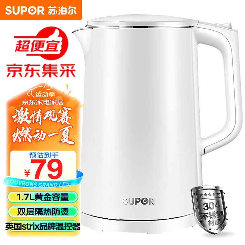 苏泊尔(SUPOR)电水壶 双层防烫烧水壶热水壶 全钢无缝内胆电热水壶SW-17J418 1.7L大容量价格:79.00元!