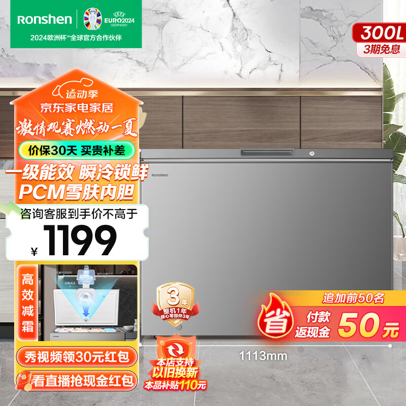 容声(Ronshen)300升大容量减霜冰柜家商两用冷藏冷冻转换单温一级能效节能省电低噪卧式冷柜 300L新品大容量减霜冷柜价格:1499.00元!