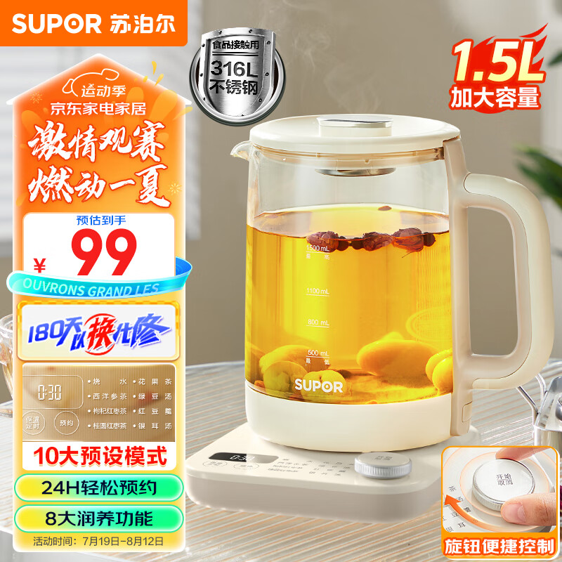 苏泊尔(SUPOR)1.5L大容量养生壶煮茶器煮茶壶316L不锈钢电水壶保温恒温花茶壶烧水壶智能旋控SW-15YT12B价格:99.00元!