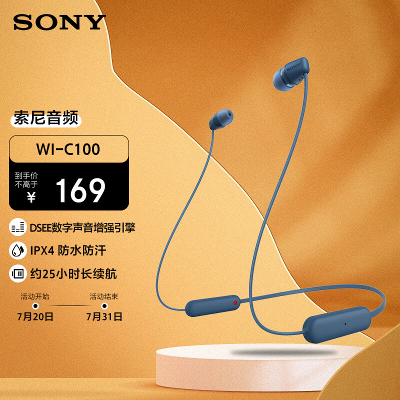 索尼(SONY)WI-C100 无线立体声 颈挂式 蓝牙耳机 IPX4防水防汗 约25小时长久续航 蓝色价格:169.00元!