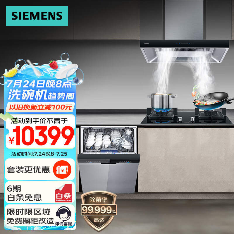 西门子烟灶洗套装 14套大容量嵌入式家用洗碗机 吸油烟机灶具套装(天然气) SJ43H+951W+A23MP价格:10399.00元!