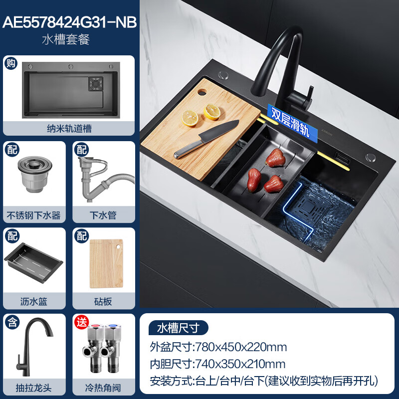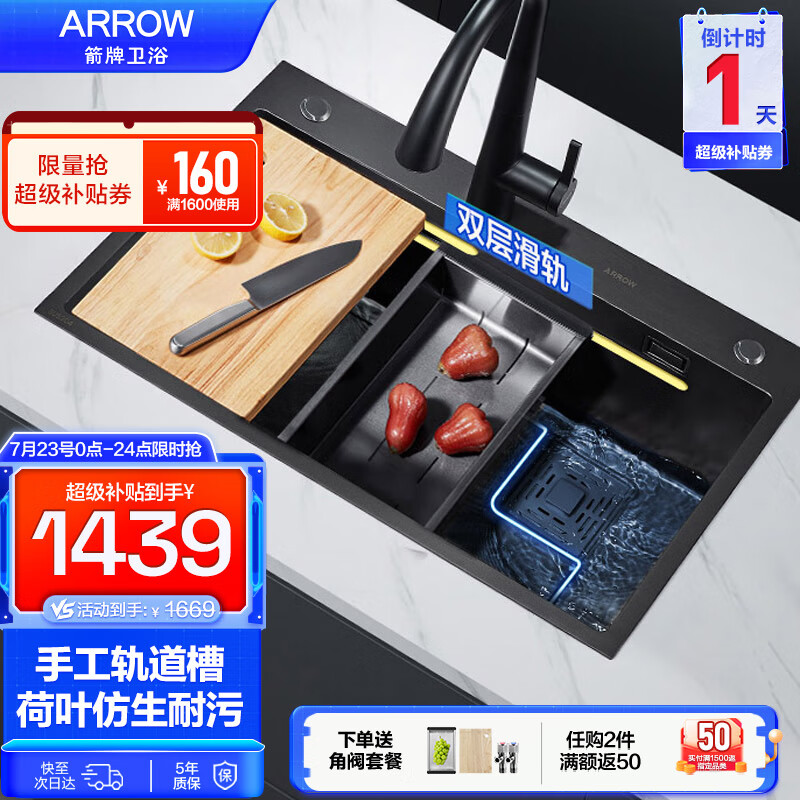 箭牌(ARROW)304不锈钢水槽手工纳米轨道大单槽厨房洗菜盆洗菜池洗碗一体盆 78黑手工纳米轨道槽-含抽拉龙头价格:1786.00元!