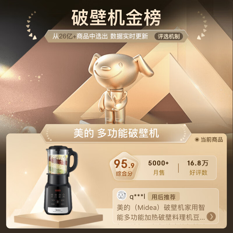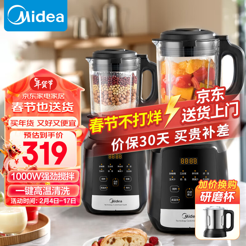 美的(Midea)破壁机1.75L家用多功能料理大容量豆浆机果汁榨汁婴儿辅食机高温清洗MJ-PB10X2-100A/100C价格:399.00元!