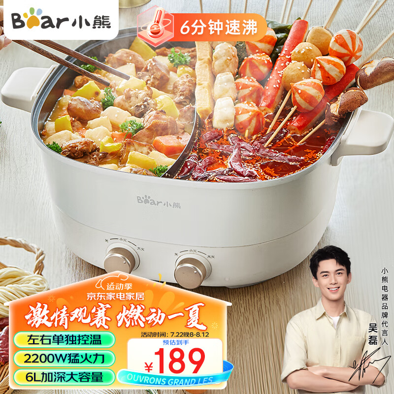 小熊(Bear)电火锅 电煮锅 鸳鸯锅 家用火锅专用锅电热锅一体多功能锅涮肉锅火锅锅具分区控温DHG-D60N1 6L价格:189.00元!