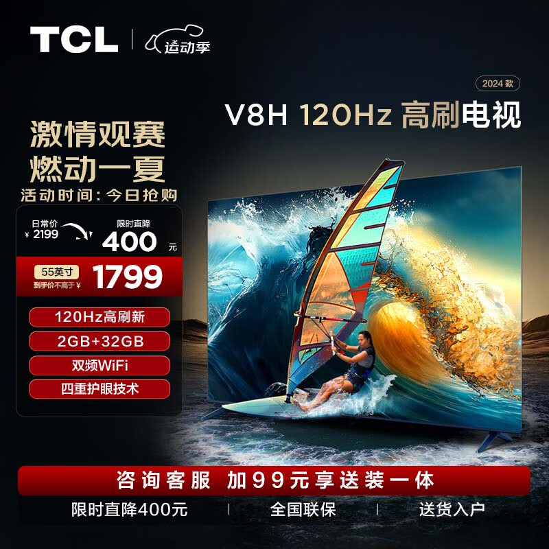 TCL电视 55V8H 55英寸 120Hz MEMC 2+32GB大内存 护眼 4K超高清 客厅家用液晶智能平板电视机 小电视价格:1799.00元!