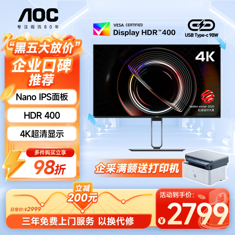 AOC电脑显示器 27英寸4K高清 90W type-c NanoIPS硬屏 HDR400 专业设计办公旋转升降支架U27U2S价格:2799.00元!