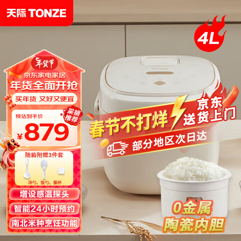 天际(TONZE)电饭煲4L 家用陶瓷内胆不粘电饭锅 大容量智能预约0涂层饭煲多功能3-8人煮粥蒸米饭锅 BYQC22C40GC价格:1029.00元!