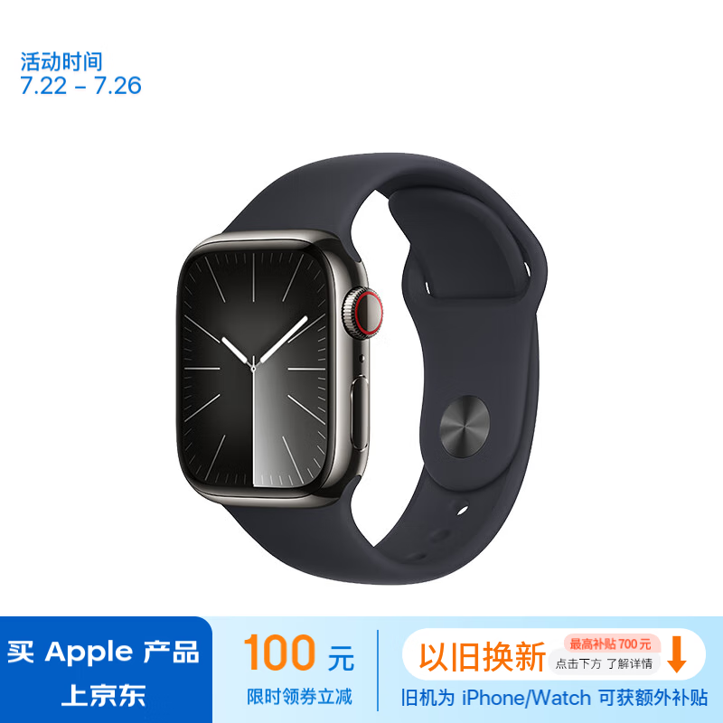 Apple/苹果 Watch Series 9 智能手表GPS+蜂窝款41毫米石墨色不锈钢表壳午夜色运动型表带S/M MRM23CH/A价格:5799.00元!