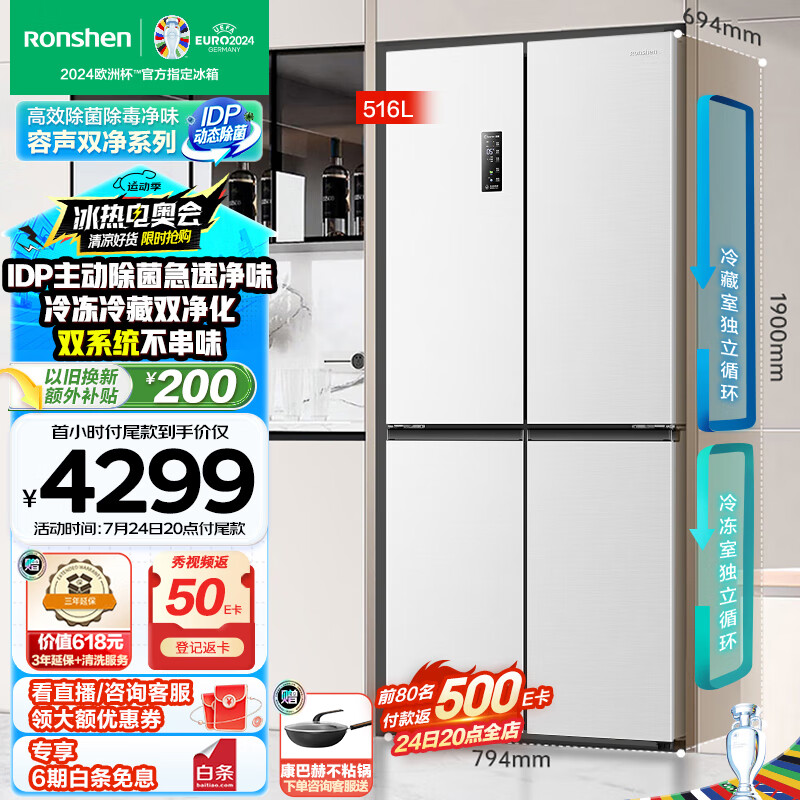 容声(Ronshen)516升双净双系统电冰箱十字双对开门四开多门家用风冷无霜白色一级节能变频大容量BCD-516WD1FPA价格:4799.00元!