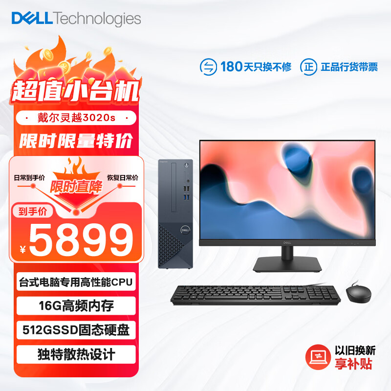 戴尔(DELL)灵越3020S 台式电脑主机 (酷睿13代i7-13700 16G 512GSSD)23.8英寸大屏显示器 高性能CPU价格:5899.00元!