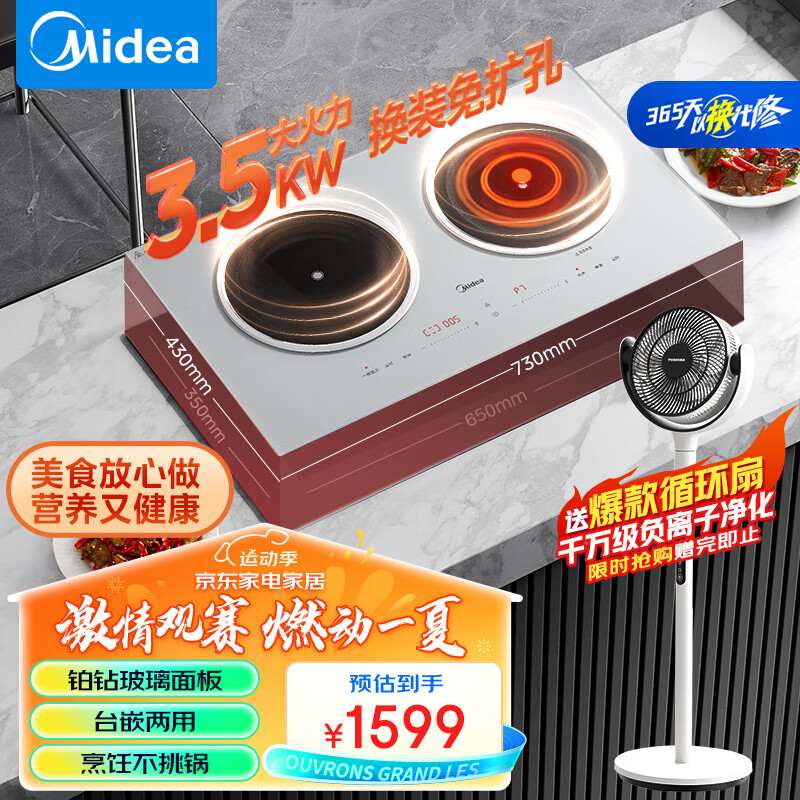 美的(Midea)电磁炉双灶 3500W家用大功率左电右陶嵌入式电陶炉不挑锅具 3H定时恒温匀火铂钻面板 MC-DZ35CT08P价格:1599.00元!