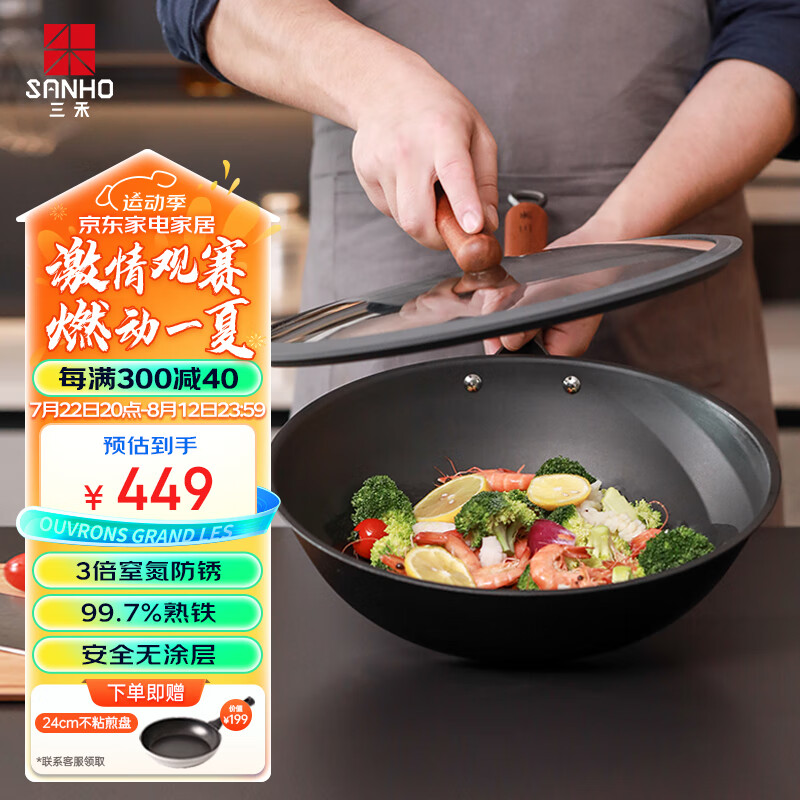 三禾无涂层熟铁锅家用炒菜锅窒氮防锈不粘炒锅少油烟轻铁锅32cm价格:799.00元!
