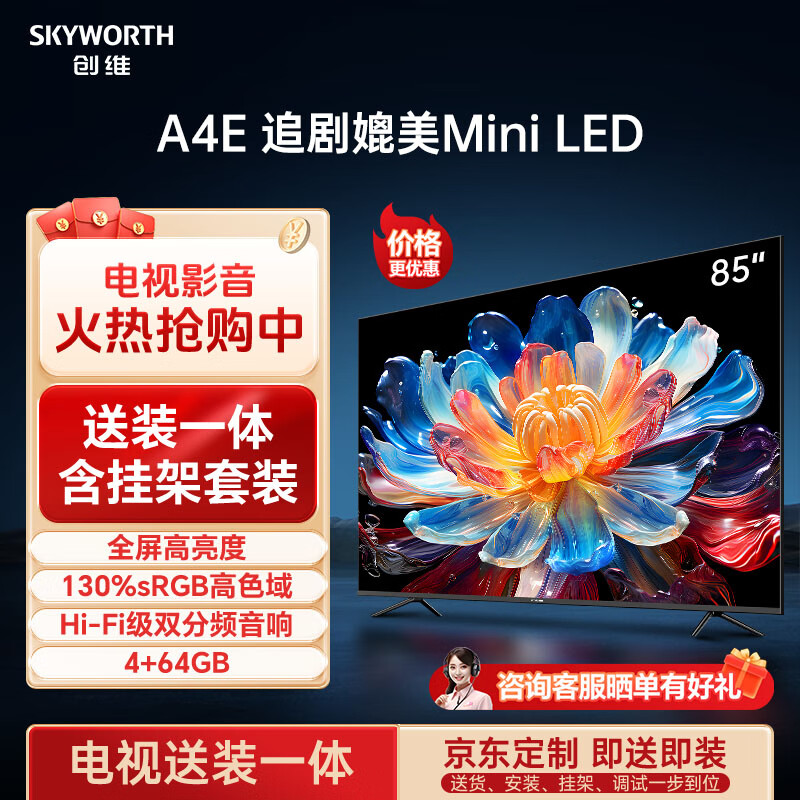 创维电视85A4E【送装一体版本】护眼电视机120Hz高刷媲美mini led 双分频音响4K超薄巨幕大屏游戏电视 价格:5562.00元!