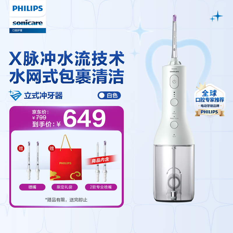 飞利浦家用立式冲牙器 七夕礼物送男/女友礼物 立式手持2种洁齿模式3级洁齿力度美牙舱 HX3826/31白色价格:729.00元!